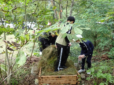 苗木植栽の様子 枯草コンポストでの堆肥づくりの様子