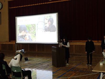 定山渓学園からの活動発表は「生き物にやさしい森を創ろう」と題して、今年度「夢の森」と「三笠緑地」で実施した活動内容等の発表がありました。