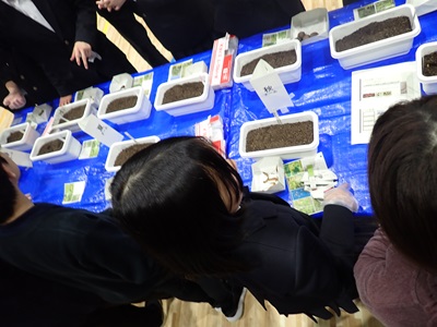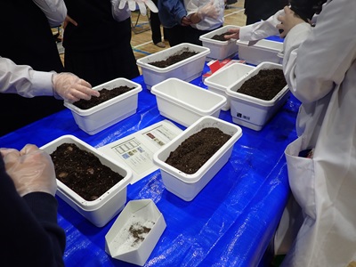 「チャレンジ タネから育てる『夢の森」」と題して、「タネの不思議 植物の作戦」の学習、タネ模型飛ばしを体験した後、クリ、シナノキ、サンショウ、イチイ(オンコ)のタネをプランターにまきました。
