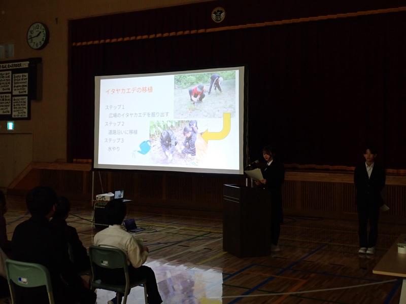 定山渓中学校からは、「森を守る活動を未来につなげよう ~人と動物に優しい森づくりを通して~ 」と題して、今年度「夢の森」と「三笠山」で実施した活動内容等の発表がありました。
