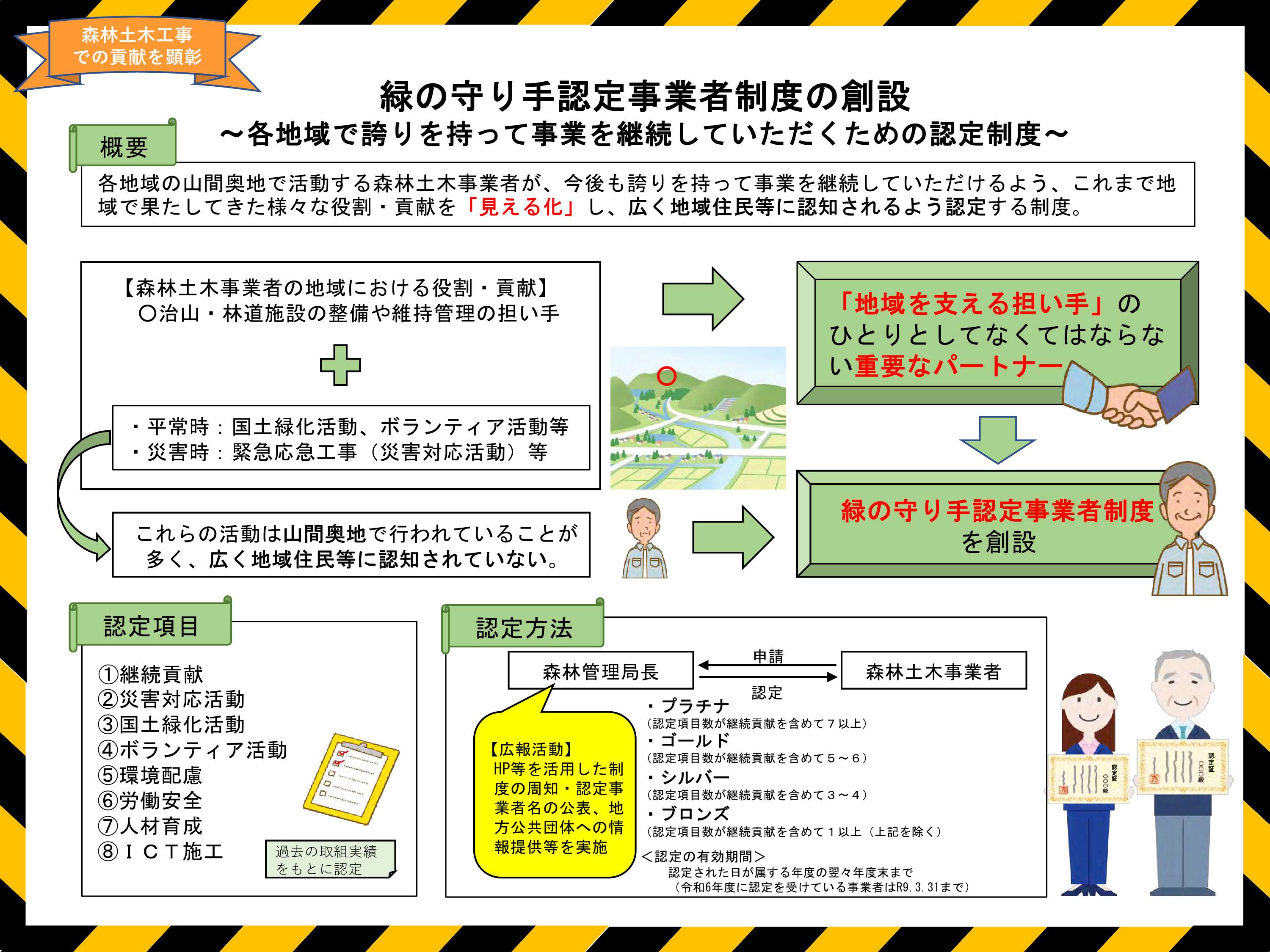 一方、森林土木事業者が活動する現場の多くが山間奥地のため、その活動内容については広く地域住民等に認知されているとは言い難いところです。このため、これまで地域で果たしてきた様々な役割・貢献について「見える化」するとともに、地域住民等に対する認知度の向上を図ることを目的として、「緑の守り手認定事業者」として認定しましたので公表します。