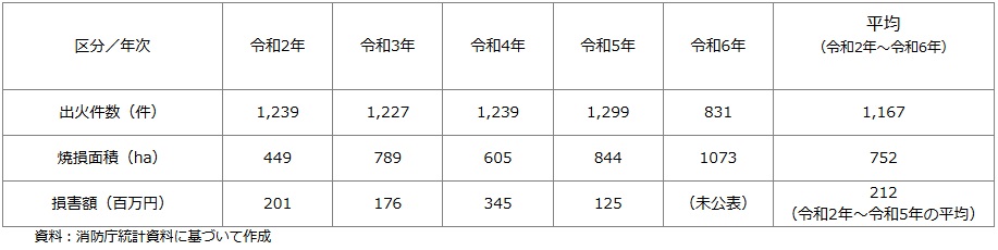 直近6年間(令和2年~令和6年)の平均でみると、1年間に約1.2千件発生し、焼損面積は約8百ha、損害額は約2.1億円になっています。 これを1日あたりにすると、全国で毎日約4件の山火事が発生し、約2haの森林が燃え、約60万円の損害が生じていることになります。
