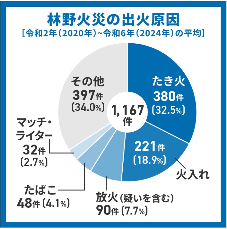 山火事を始めとする林野火災の出火原因の多くは、人的要因によるものです。特に2月から5月は、枯れた草や葉を焼却するための「たき火」や、害虫駆除などを目的として草や木などを広く焼却する「火入れ」が行われるなど、火を扱う機会が増えますが、その際に消火が不十分であったり、強風下などの気象条件で火を扱ったりすることなどが原因です。ほかにも、春先には山菜採りやハイキングなどで入山者が増えることで、たばこなど火の不始末が発生しやすくなることにも注意が必要です。