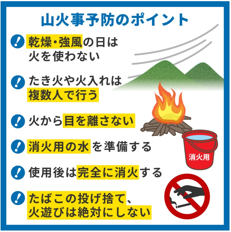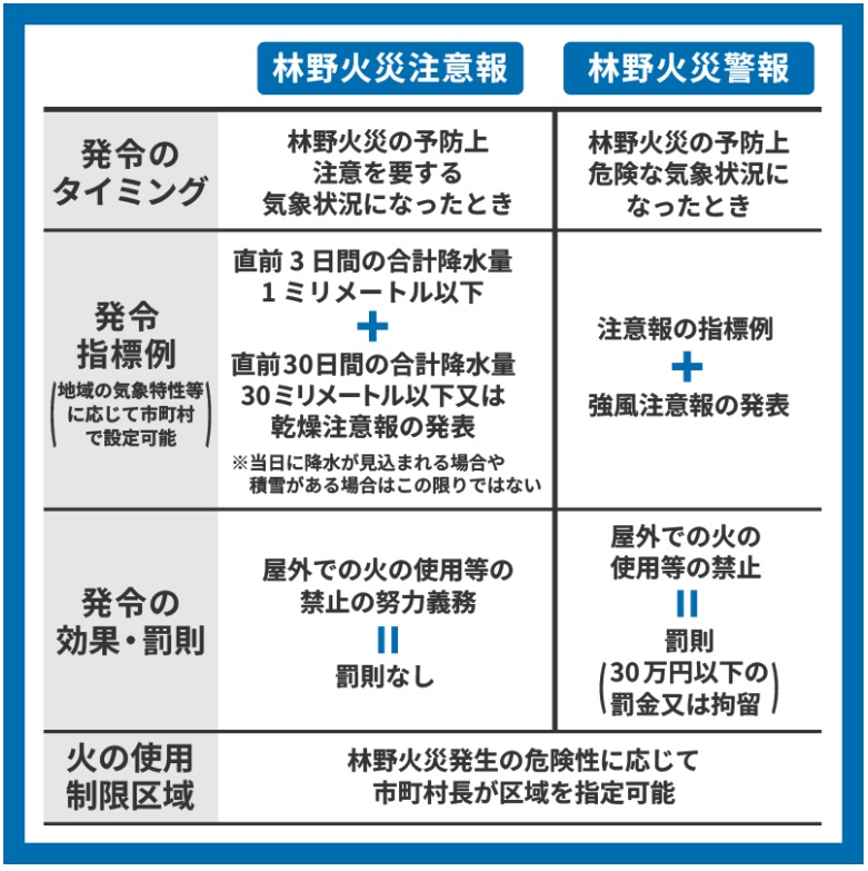 林野火災注意報・警報の発令基準、火の使用に関する具体の禁止行為などは市町村により異なる場合があります。