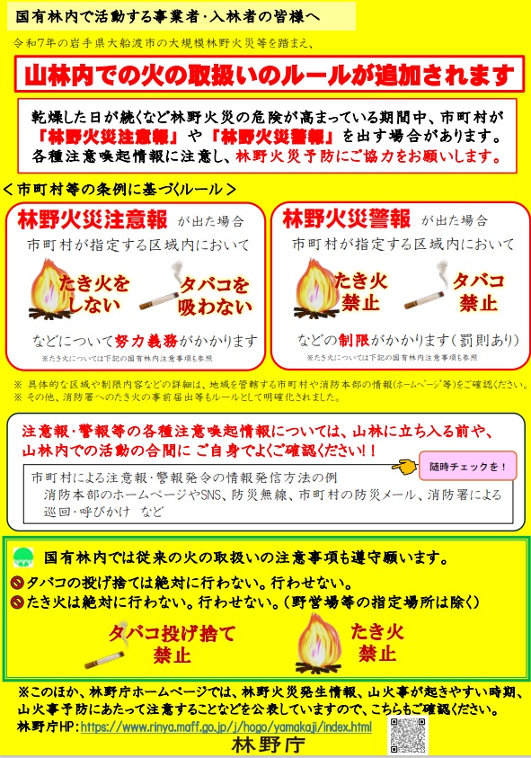 消防庁では令和7年の大船渡市などでの大規模林野火災を踏まえて、林野火災注意報や林野火災警報を創設し、全国の市町村に的確な発令などの運用を呼び掛けています。林野火災注意報や林野火災警報は、市町村の火災予防条例で規定され、市町村長が林野火災の危険性に応じて発令するもので、令和8年1月から全国の多くの市町村で運用が始まりました。〇林野火災注意報:降水量や乾燥といった条件により林野火災が発生・延焼しやすい危険な状況です。発令時には、その地域では屋外での火の使用をひかえるよう努める必要があります。