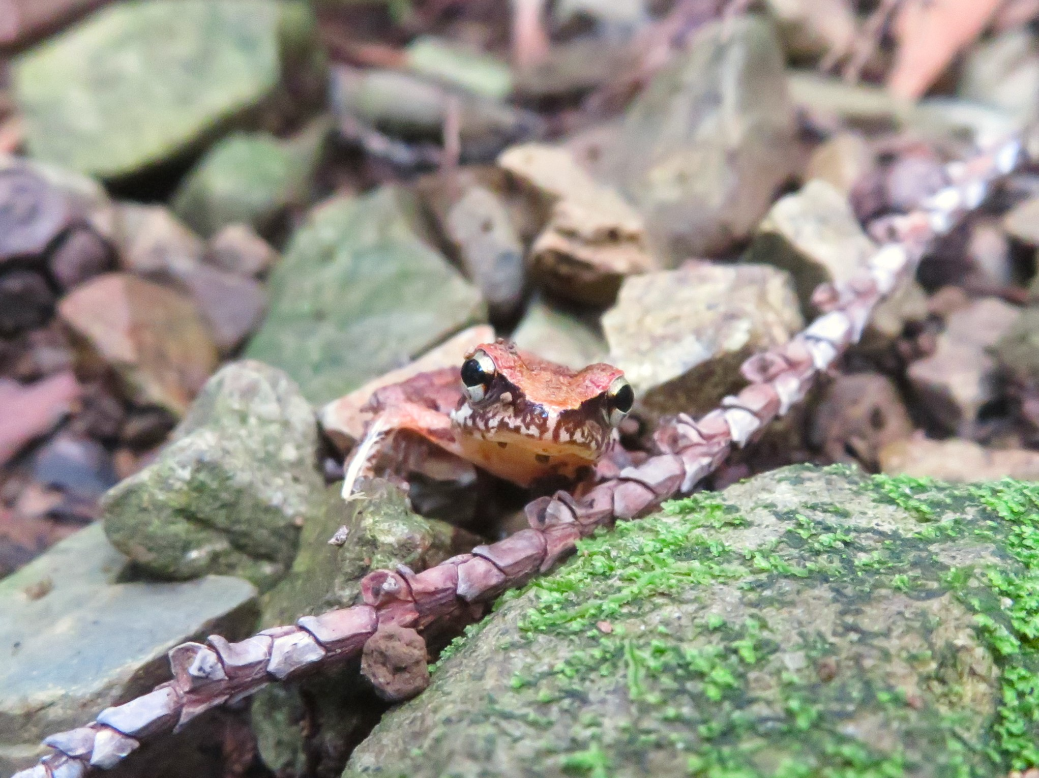 まだまだオタマジャクシと変わらない大きさなので、ただの砂利道もこの子にとっては岩場のアスレチックのようです。