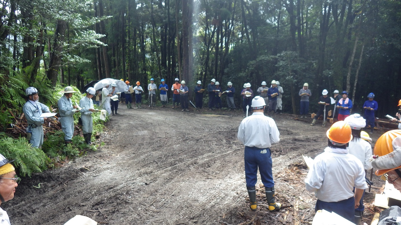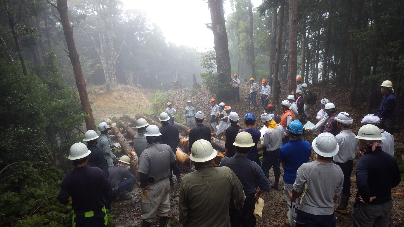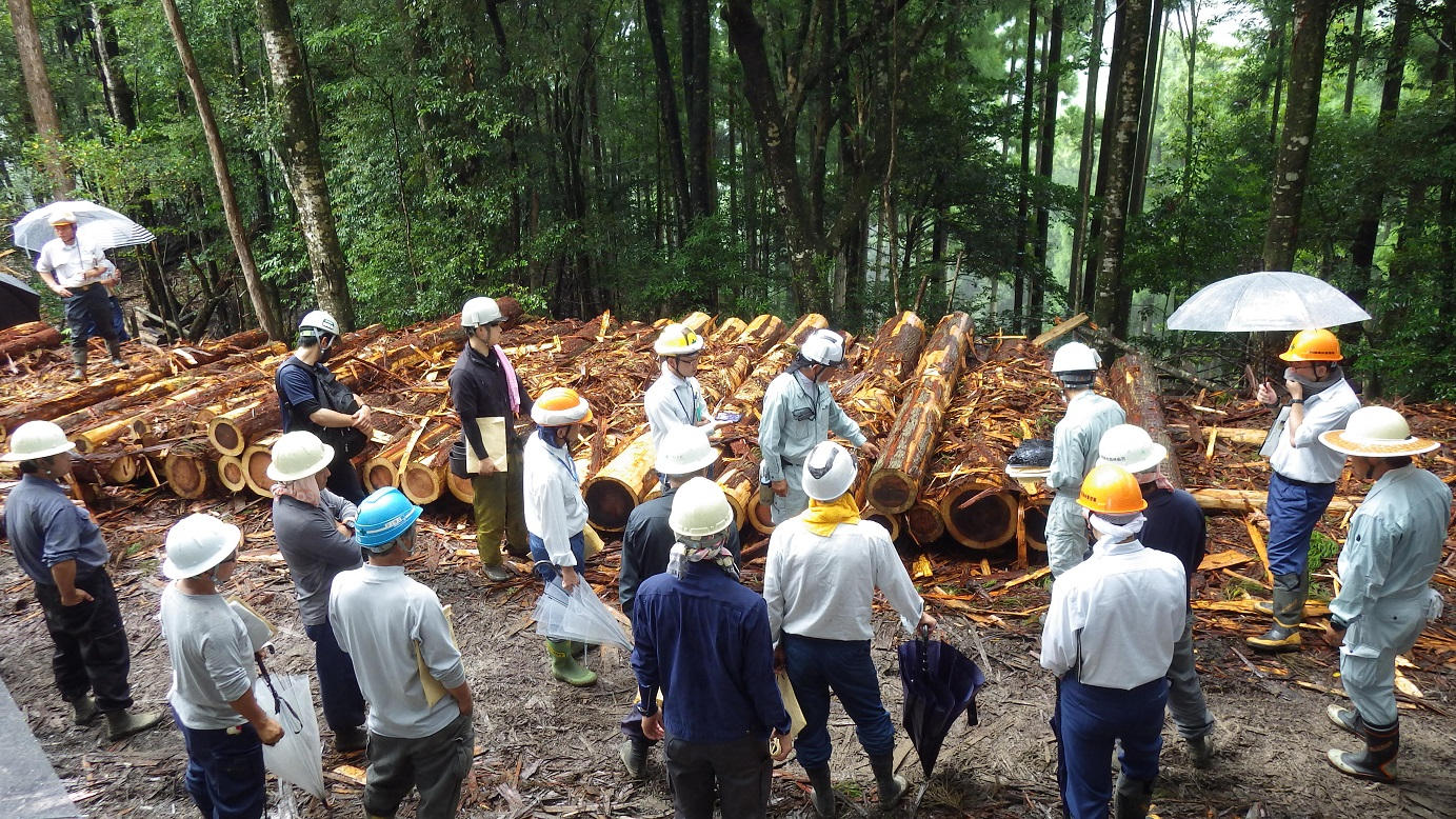 | 令和6年9月10日、安芸森林管理署管内の後ロ山(うしろやま)国有林において、「素材生産における採材技術の向上及び生産性向上に向けた現地検討会」を総勢37名の参加のもと開催しました。 例年、安芸署では、木材を山で生産する際に、木材の品質に応じて丸太の長さを決める「採材」について、その技術の向上を図る現地検討会を開催しています。 今回の検討会は、例年の採材技術の向上に加え、生産性の向上の重要性と意味について、発注者と各事業体の間で確認を行い、更なる技術の向上を目指すことを目的に行いました。 |