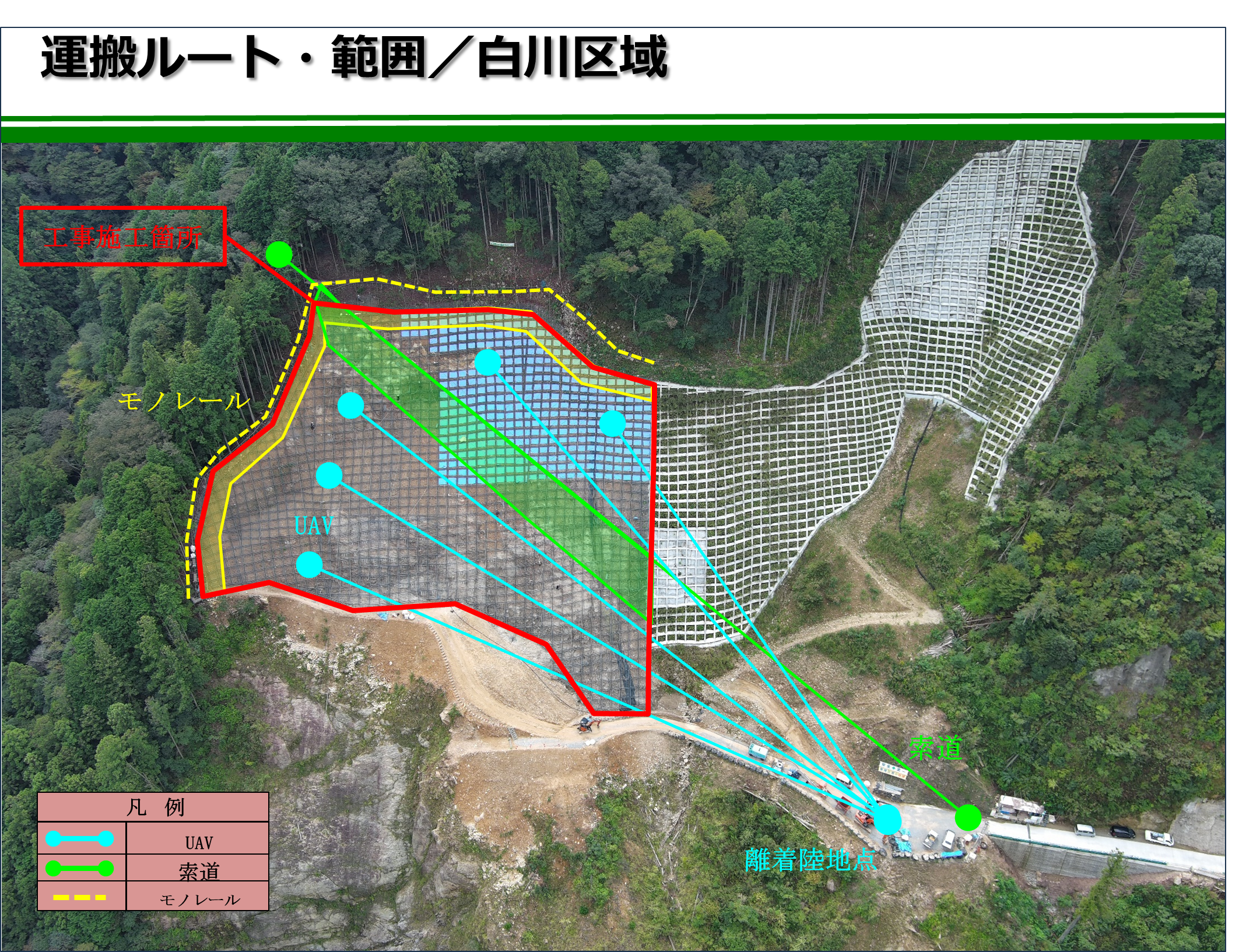 白川区域では、斜面安定化を目的とした工事が進行中。従来の索道やモノレールでは対応できない箇所があり、資材の人力運搬が課題でした。