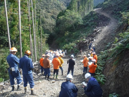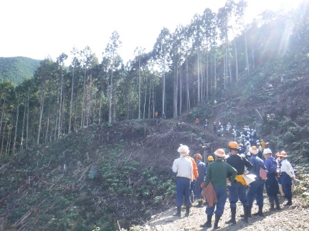 また、高知県から提案を受けて実施する長方形植えの実証地については、幡多林業事務所の担当者からご説明いただき、実際の植え幅を参加者にご確認いただきました。その後、全体を通じて、意見交換を実施しました。